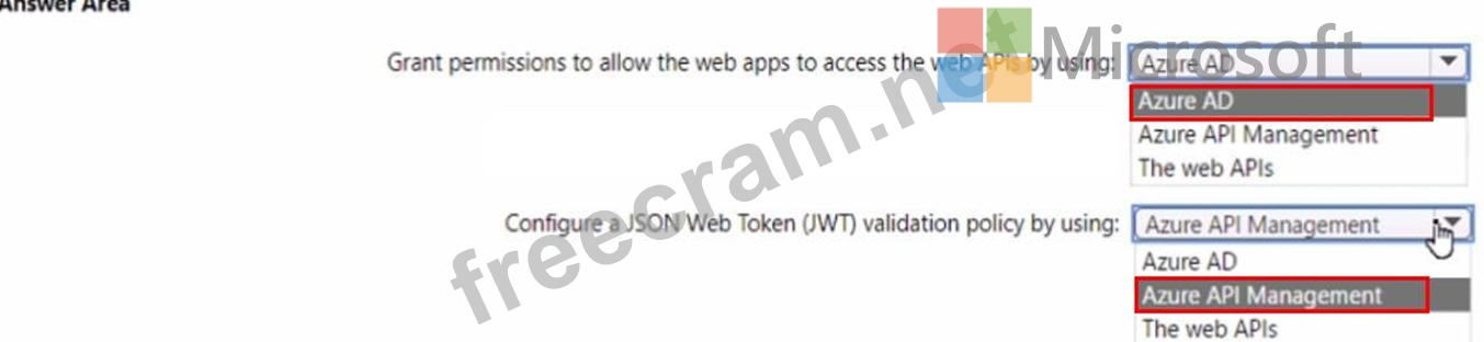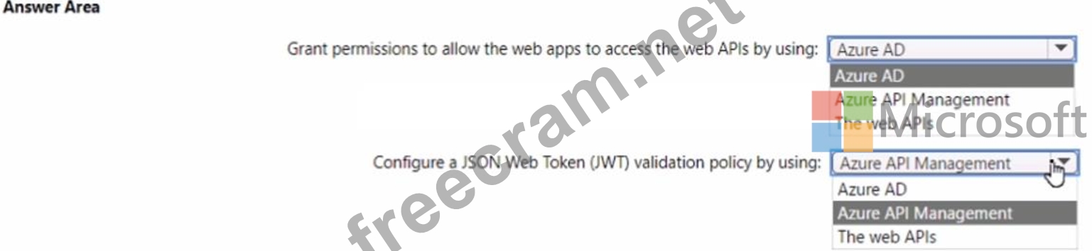 The company is developing 10 web apps that will use the web APIs. The web apps and the APIs are registered in the company s Azure AD tenant. The web APIs are published by using Azure API Management.