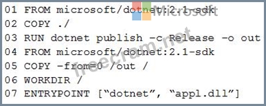 You plan to create an image that will contain a .NET Core application. You have a Dockerfile file that contains the following code. (Line numbers are included for reference only.) You need to ensure that the image is as small as possible when the image is built. Which line should you modify in the file?