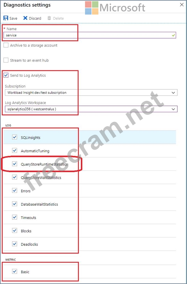 B. To enable streaming of diagnostic telemetry for a single or a pooled database, follow these steps: 1. Go to Azure SQL database resource. 2. Select Diagnostics settings. 3. Select Turn on diagnostics if no previous settings exist, or select Edit setting to edit a previous setting. You can create up to three parallel connections to stream diagnostic telemetry. 4. Select Add diagnostic setting to configure parallel streaming of diagnostics data to multiple resources. 5. Enter a setting name for your own reference. 6. Select a destination resource for the streaming diagnostics data: Archive to storage account, Stream to an event hub, or Send to Log Analytics. 7. For the standard, event-based monitoring experience, select the following check boxes for database diagnostics log telemetry: QueryStoreRuntimeStatistics 8. For an advanced, one-minute-based monitoring experience, select the check box for Basic metrics. 9. Select Save.