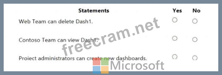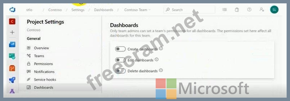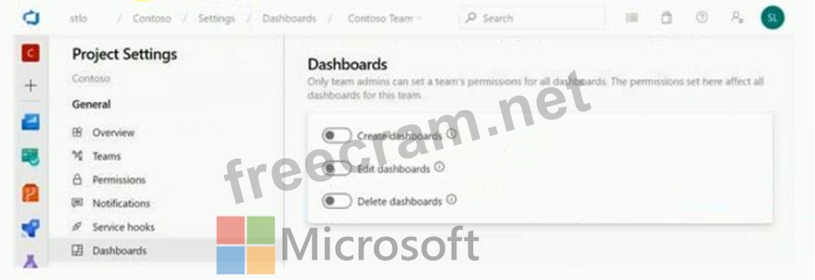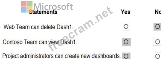 You configure the dashboard permissions for the Contoso project as shown in the Permissions exhibit (Click the Permissions tab.)