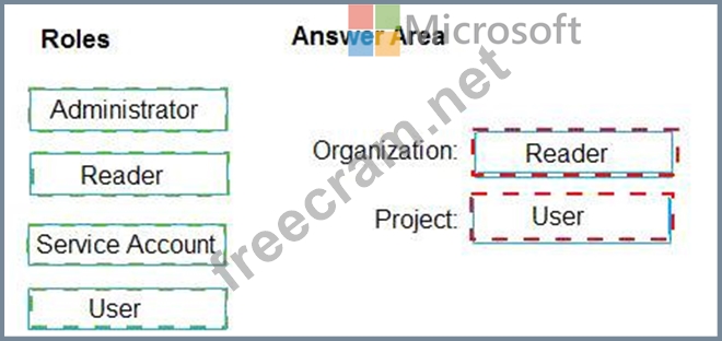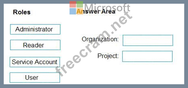 Which role memberships are required for the Azure 0e%Oos organization and the project? To answer, drag the appropriate role membership to the correct targets. Each role membership may be used once, more than once, or not at all. You may need to drag the split bar between panes or scroll to content NOTE: Each correct selection is worth one point.
