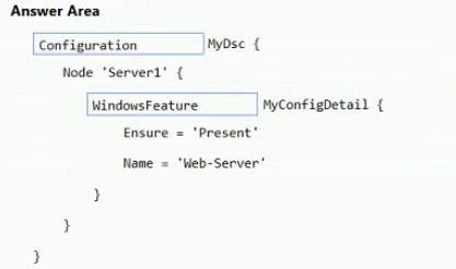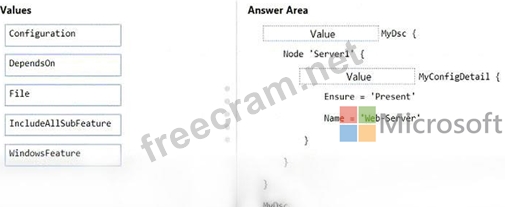 How should you complete the Desired State Configuration (DSQ configuration script? To answer, drag the appropriate values to the correct locations. Each value may be used once, more than once, or not at all. You may need to drag the split bar between panes or scroll to view content.