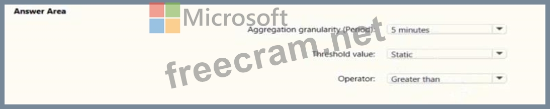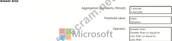 Note: We [Microsoft] recommend choosing an Aggregation granularity (Period) that is larger than the Frequency of evaluation, to reduce the likelihood of missing the first evaluation of added time series Box 2: Static Box 3: Greater than Example, say you have an App Service plan for your website. You want to monitor CPU usage on multiple instances running your web site/app. You can do that using a metric alert rule as follows: