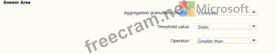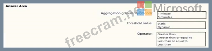 Note: We [Microsoft] recommend choosing an Aggregation granularity (Period) that is larger than the Frequency of evaluation, to reduce the likelihood of missing the first evaluation of added time series Box 2: Static Box 3: Greater than Example, say you have an App Service plan for your website. You want to monitor CPU usage on multiple instances running your web site/app. You can do that using a metric alert rule as follows: