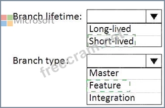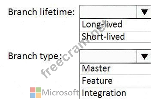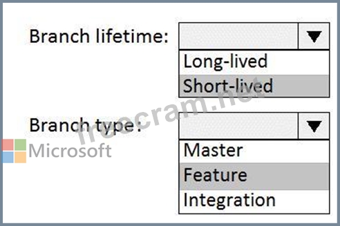 Which branch lifetime and branch time should you use in the branching model? To answer, select the appropriate options in the answer area.