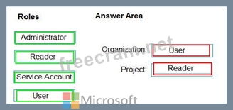 Which role memberships are required for the Azure 0e%Oos organization and the project? To answer, drag the appropriate role membership to the correct targets. Each role membership may be used once, more than once, or not at all. You may need to drag the split bar between panes or scroll to content NOTE: Each correct selection is worth one point.