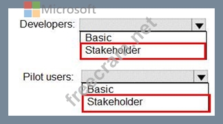 You need to identify which access levels are required to ensure that developers can request and gather feedback from the pilot users. The solution must use the principle of least privilege.