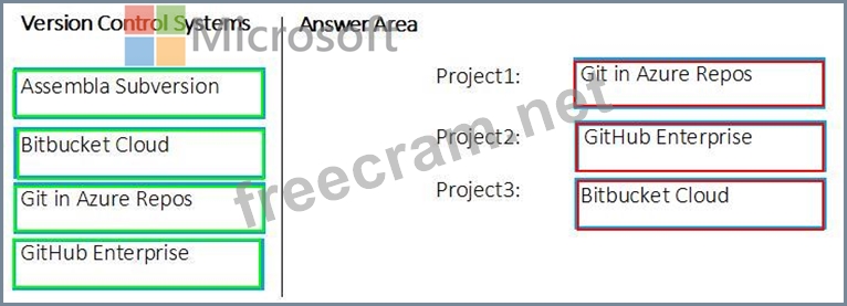Which version control system should you recommend for each project? To answer, drag the appropriate version control systems to the correct projects. Each version control system may be used once, more than once, or not at all. You may need to drag the split bar between panes or scroll to view content.
