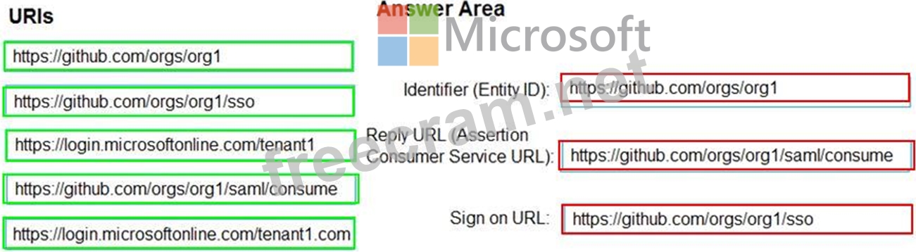 Which URIs should you use for the SAML configuration in Azure AD? To answer, drag the appropriate URIs to the correct settings. Each URI may be used once, more than once, or not at all. You may need to drag the split bar between panes or scroll to view content.