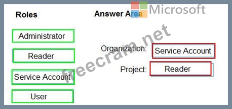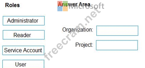 Which role memberships are required for the Azure 0e%Oos organization and the project? To answer, drag the appropriate role membership to the correct targets. Each role membership may be used once, more than once, or not at all. You may need to drag the split bar between panes or scroll to content NOTE: Each correct selection is worth one point.