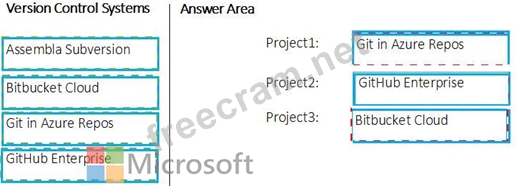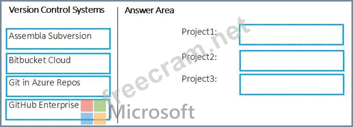Which version control system should you recommend for each project? To answer, drag the appropriate version control systems to the correct projects. Each version control system may be used once, more than once, or not at all. You may need to drag the split bar between panes or scroll to view content.