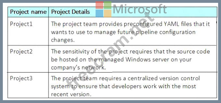 You are configuring Azure Pipelines for three projects in Azure DevOps as shown in the following table.