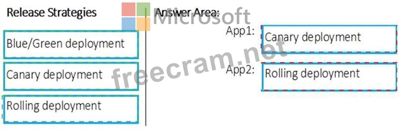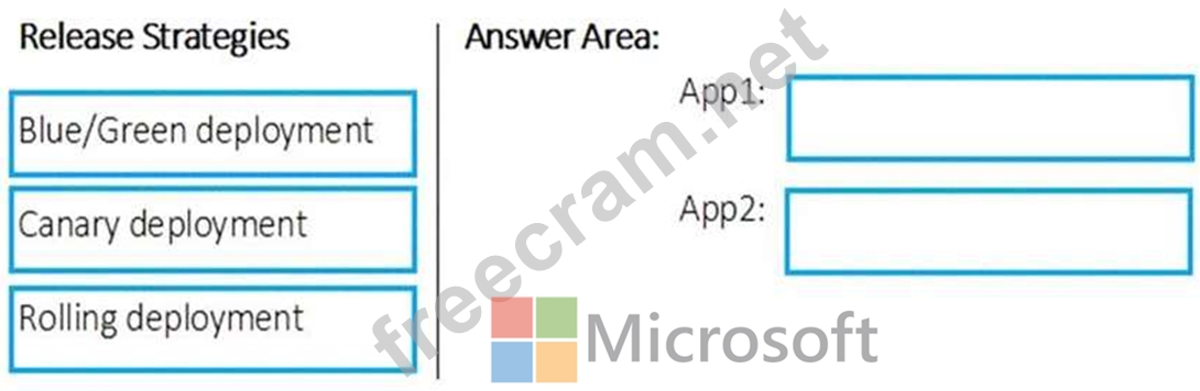 Which release strategy should you use for each application? To answer, drag the appropriate release strategies to the correct applications. Each release strategy may be used once, more than once, or not at all. You may need to drag the split bar between panes or scroll to view content.