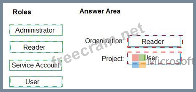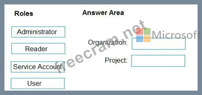 Which role memberships are required for the Azure 0e%Oos organization and the project? To answer, drag the appropriate role membership to the correct targets. Each role membership may be used once, more than once, or not at all. You may need to drag the split bar between panes or scroll to content NOTE: Each correct selection is worth one point.