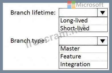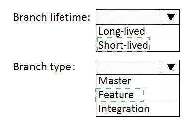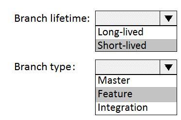 Which branch lifetime and branch time should you use in the branching model? To answer, select the appropriate options in the answer area.