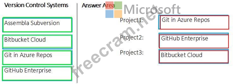 Which version control system should you recommend for each project? To answer, drag the appropriate version control systems to the correct projects. Each version control system may be used once, more than once, or not at all. You may need to drag the split bar between panes or scroll to view content.