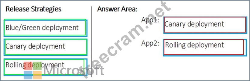 Which release strategy should you use for each application? To answer, drag the appropriate release strategies to the correct applications. Each release strategy may be used once, more than once, or not at all. You may need to drag the split bar between panes or scroll to view content.