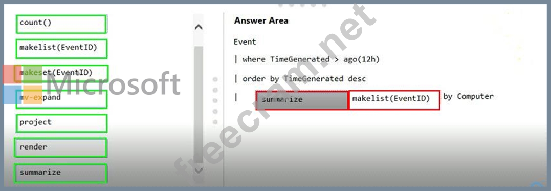 How should you complete the Azure Monitor query? To answer, drag the appropriate values to the correct locations. Each value may be used once, more than once, or not at all. You may need to drag the split bar between panes or scroll to view content.