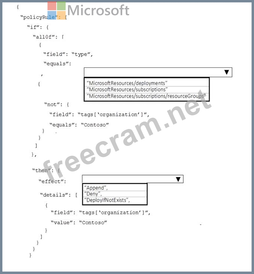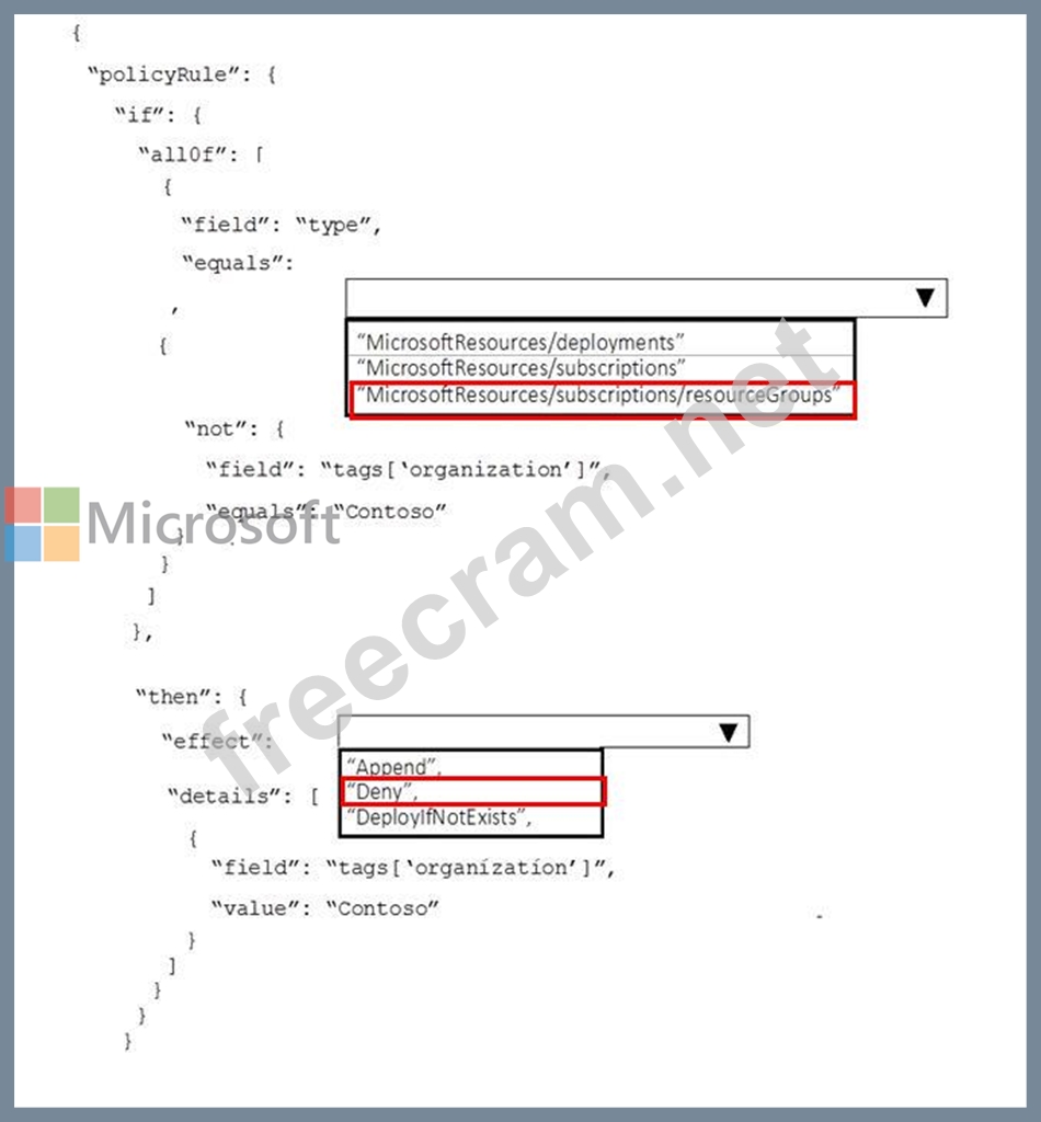 The company requires that all resource group in the subscription have a tag named organization set to a value of Contoso.