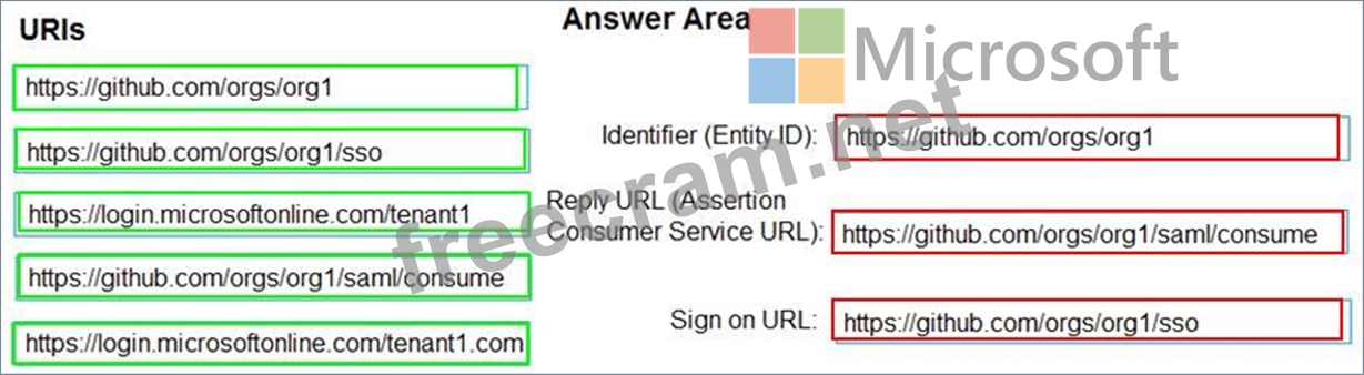 Which URIs should you use for the SAML configuration in Azure AD? To answer, drag the appropriate URIs to the correct settings. Each URI may be used once, more than once, or not at all. You may need to drag the split bar between panes or scroll to view content.