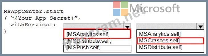 How should you complete the code to initialize App Center in the mobile application? To answer, select the appropriate options in the answer area.