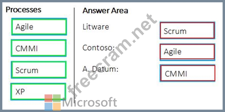 Which work item process should you use for each customer? To answer, drag the appropriate work item process to the correct customers. Each work item process may be used once, more than once, or not at all. You may need to drag the split bar between panes or scroll to view content.