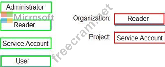 Which role memberships are required for the Azure DevOps organization and the project? To answer, drag the appropriate role memberships to the correct targets. Each role membership may be used once, more than once, or not at all. You may need to drag the split bar between panes or scroll to view content.