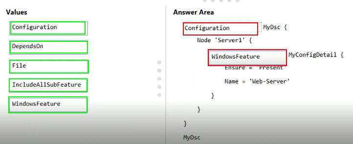 How should you complete the Desired State Configuration (DSQ configuration script? To answer, drag the appropriate values to the correct locations. Each value may be used once, more than once, or not at all. You may need to drag the split bar between panes or scroll to view content.