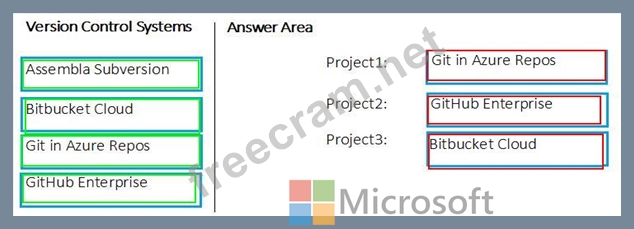 Which version control system should you recommend for each project? To answer, drag the appropriate version control systems to the correct projects. Each version control system may be used once, more than once, or not at all. You may need to drag the split bar between panes or scroll to view content.