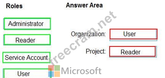 Which role memberships are required for the Azure 0e%Oos organization and the project? To answer, drag the appropriate role membership to the correct targets. Each role membership may be used once, more than once, or not at all. You may need to drag the split bar between panes or scroll to content NOTE: Each correct selection is worth one point.