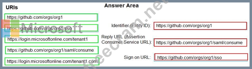 Which URIs should you use for the SAML configuration in Azure AD? To answer, drag the appropriate URIs to the correct settings. Each URI may be used once, more than once, or not at all. You may need to drag the split bar between panes or scroll to view content.