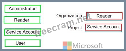 Which role memberships are required for the Azure DevOps organization and the project? To answer, drag the appropriate role memberships to the correct targets. Each role membership may be used once, more than once, or not at all. You may need to drag the split bar between panes or scroll to view content.