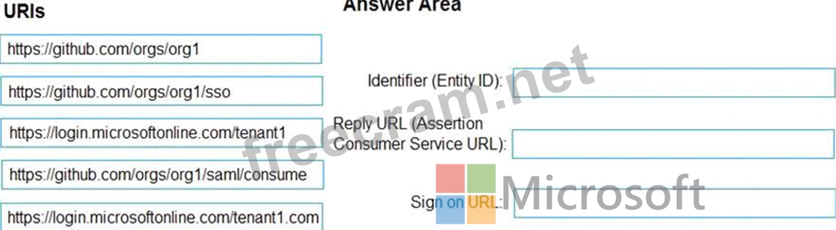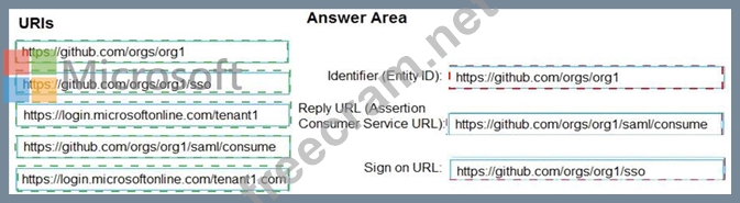 Which URIs should you use for the SAML configuration in Azure AD? To answer, drag the appropriate URIs to the correct settings. Each URI may be used once, more than once, or not at all. You may need to drag the split bar between panes or scroll to view content.