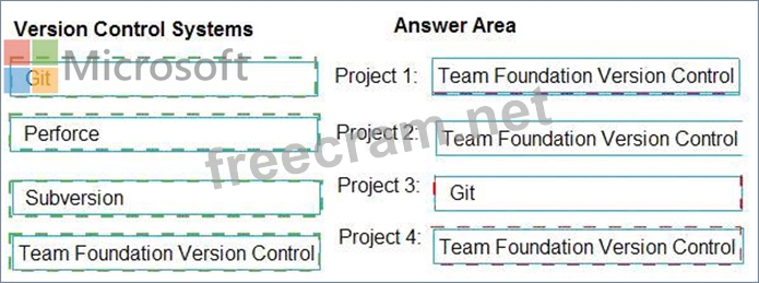 Which version control system should you use for each project? To answer, drag the appropriate version control systems to the correct projects. Each version control system may be used once, more than once, or not at all.