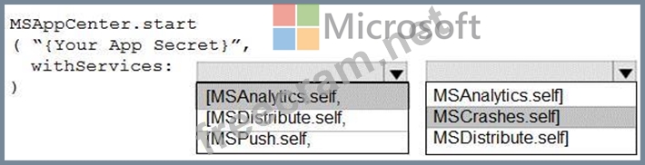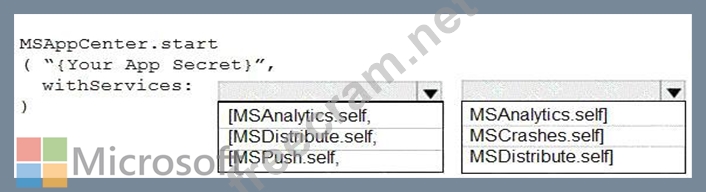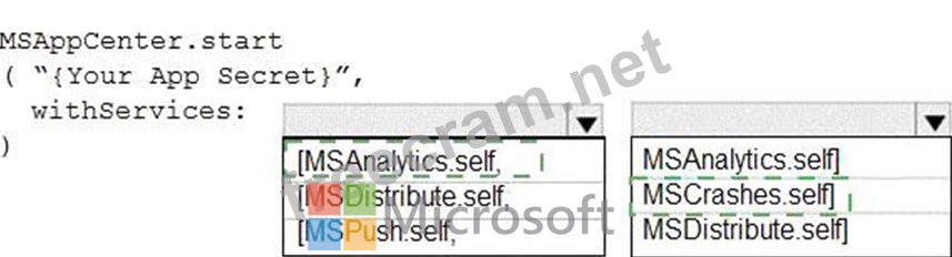 How should you complete the code to initialize App Center in the mobile application? To answer, select the appropriate options in the answer area.