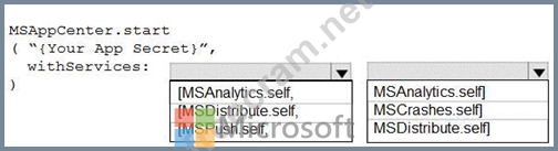 How should you complete the code to initialize App Center in the mobile application? To answer, select the appropriate options in the answer area.