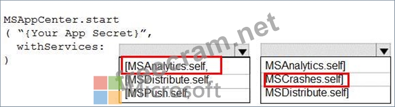 How should you complete the code to initialize App Center in the mobile application? To answer, select the appropriate options in the answer area.