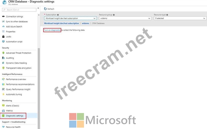 7. For the standard, event-based monitoring experience, select the following check boxes for database diagnostics log telemetry: QueryStoreRuntimeStatistics