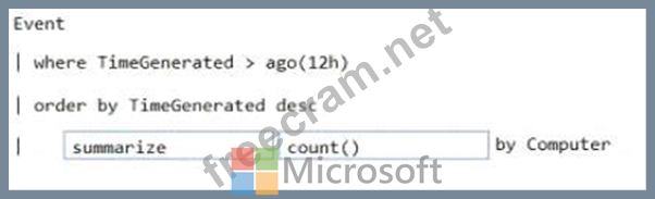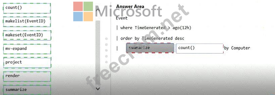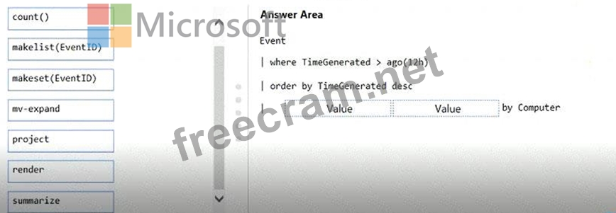 How should you complete the Azure Monitor query? To answer, drag the appropriate values to the correct locations. Each value may be used once, more than once, or not at all. You may need to drag the split bar between panes or scroll to view content.