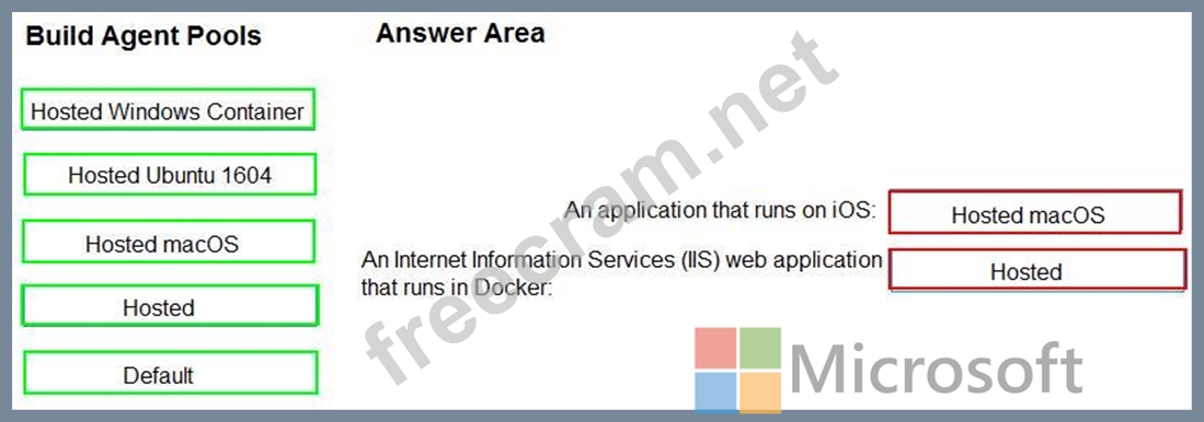 Which build agent pool should you use to compile each application type? To answer, drag the appropriate built agent pools to the correct application types. Each butt agent pool may be used once, more than once, or not at all. You may need to drag the split bar between panes or scroll to view content.
