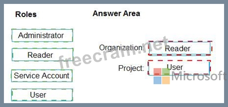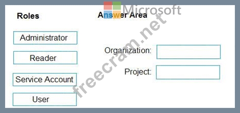 Which role memberships are required for the Azure 0e%Oos organization and the project? To answer, drag the appropriate role membership to the correct targets. Each role membership may be used once, more than once, or not at all. You may need to drag the split bar between panes or scroll to content NOTE: Each correct selection is worth one point.