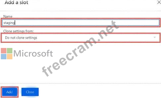 3. In the Add a slot dialog box, give the slot a name, and select whether to clone an app configuration from another deployment slot. Select Add to continue.