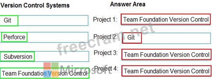 Which version control system should you use for each project? To answer, drag the appropriate version control systems to the correct projects. Each version control system may be used once, more than once, or not at all. You may need to drag the split bar between panes or scroll to view content.