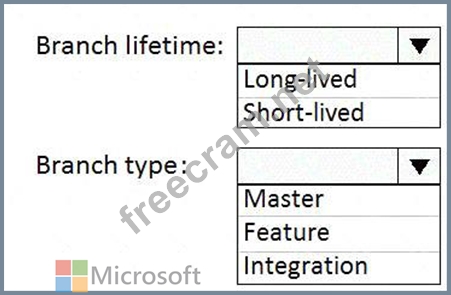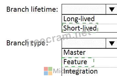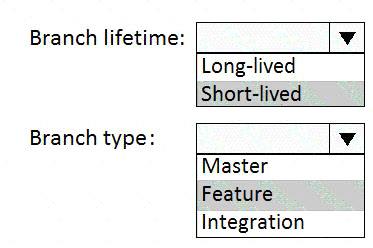 Which branch lifetime and branch time should you use in the branching model? To answer, select the appropriate options in the answer area.