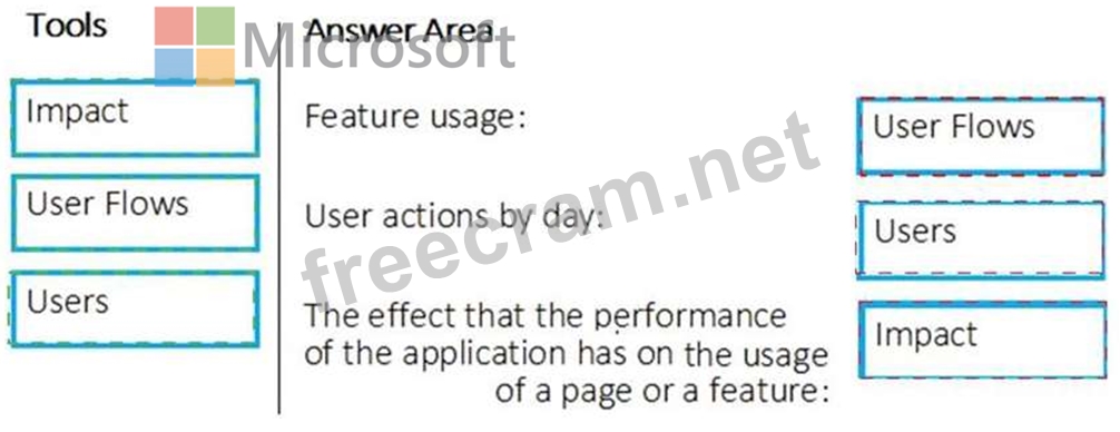 Which application Insights tool should you use to analyze each behavior? To answer, drag the appropriate tools to the correct behaviors. Each tool may be used once, more than once, or not at all. You may need to drag the split bar between panes or scroll to view content.