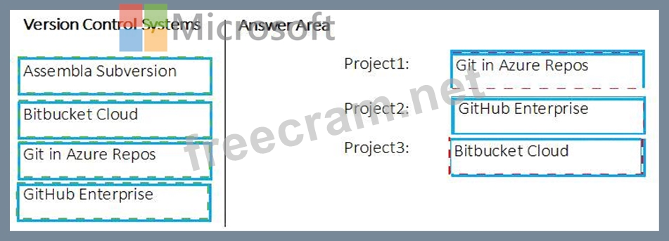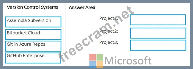 Which version control system should you recommend for each project? To answer, drag the appropriate version control systems to the correct projects. Each version control system may be used once, more than once, or not at all. You may need to drag the split bar between panes or scroll to view content.
