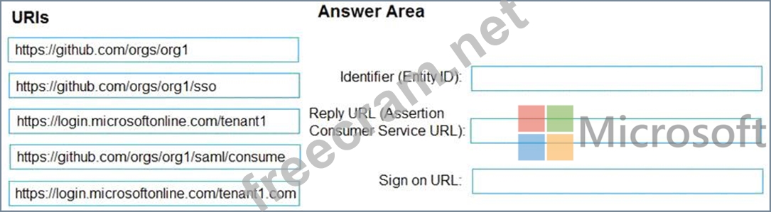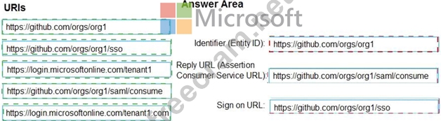 Which URIs should you use for the SAML configuration in Azure AD? To answer, drag the appropriate URIs to the correct settings. Each URI may be used once, more than once, or not at all. You may need to drag the split bar between panes or scroll to view content.