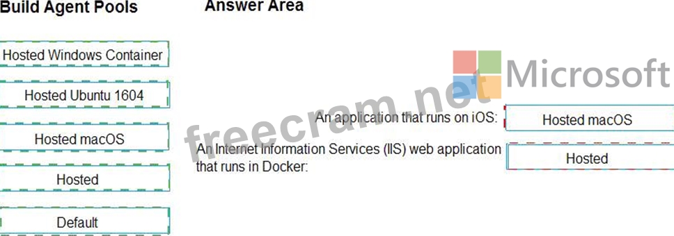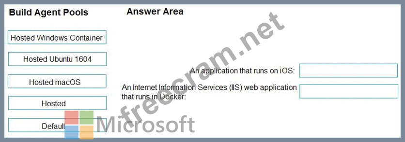 Which build agent pool should you use to compile each application type? To answer, drag the appropriate built agent pools to the correct application types. Each butt agent pool may be used once, more than once, or not at all. You may need to drag the split bar between panes or scroll to view content.