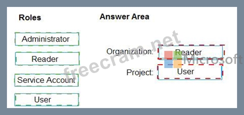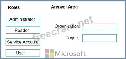 Which role memberships are required for the Azure 0e%Oos organization and the project? To answer, drag the appropriate role membership to the correct targets. Each role membership may be used once, more than once, or not at all. You may need to drag the split bar between panes or scroll to content NOTE: Each correct selection is worth one point.