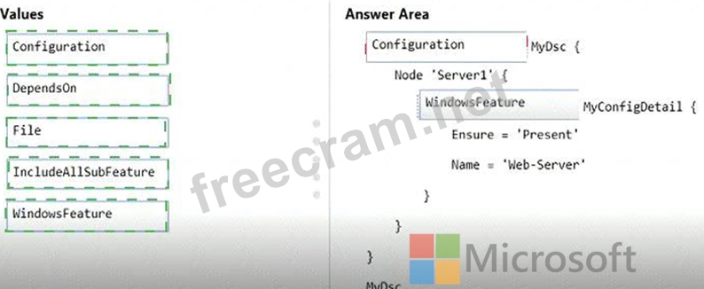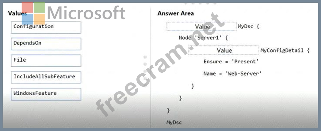 How should you complete the Desired State Configuration (DSQ configuration script? To answer, drag the appropriate values to the correct locations. Each value may be used once, more than once, or not at all. You may need to drag the split bar between panes or scroll to view content.